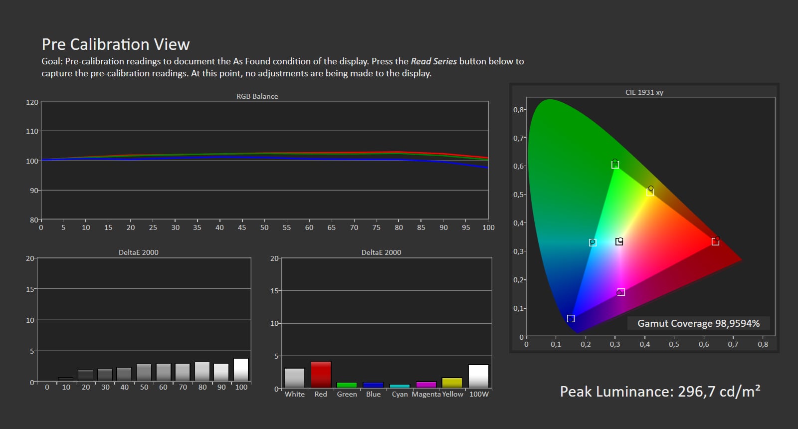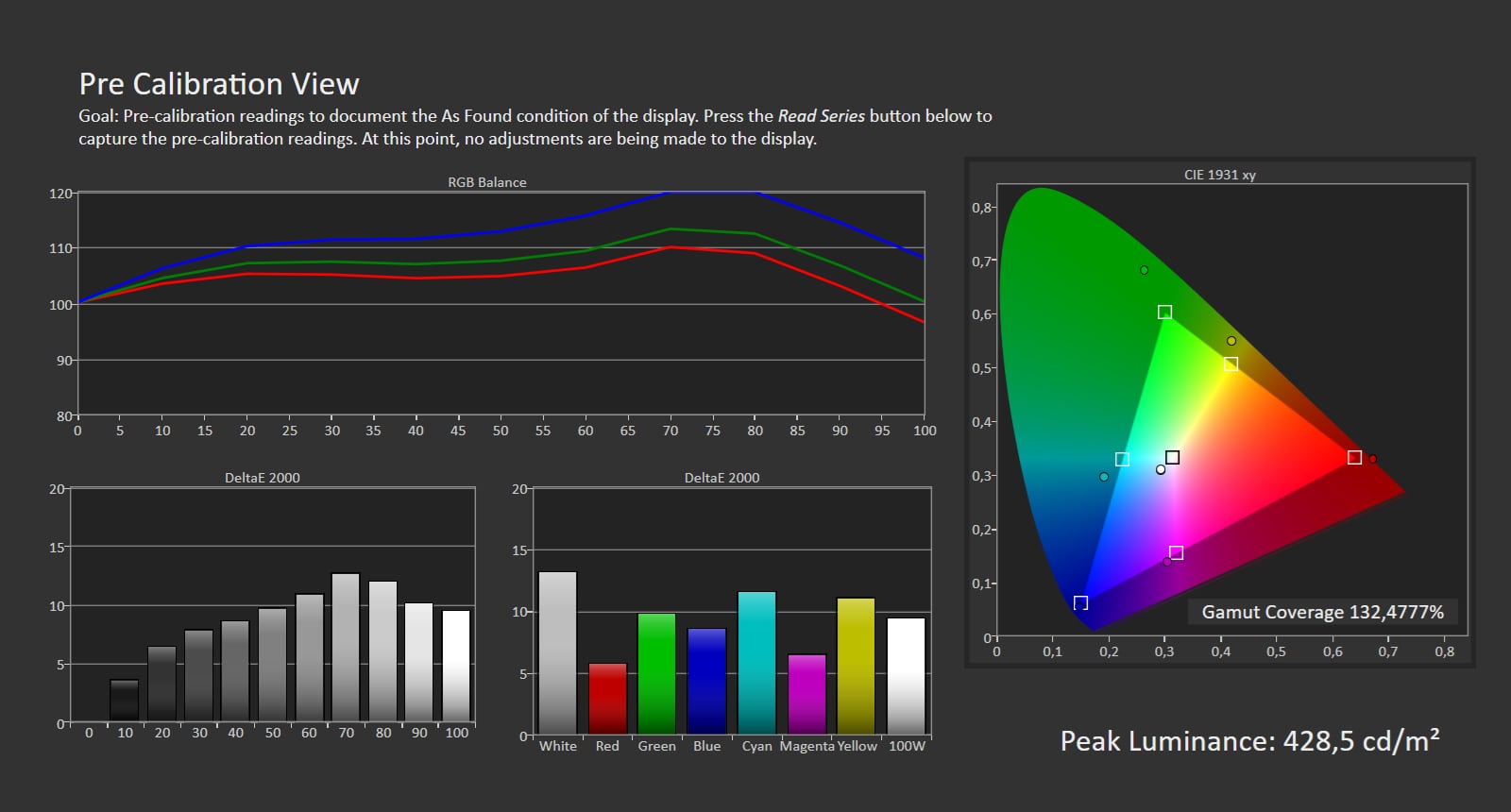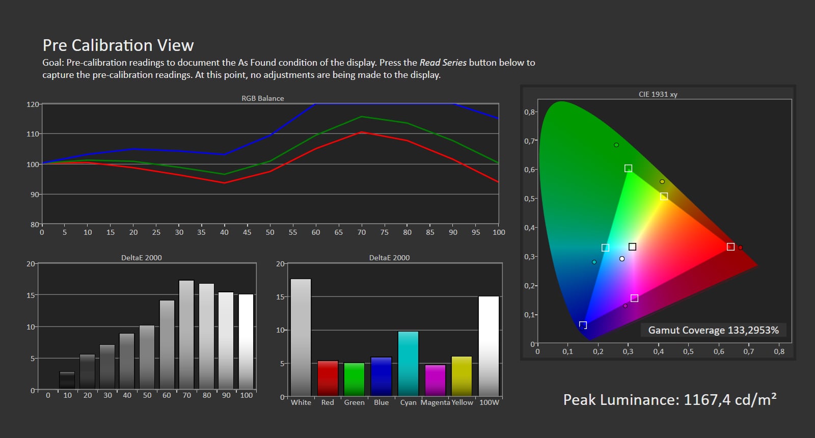 Som altid er der et utal af billedprofiler at vælge mellem. TV'et står som udgangspunkt i Eco-tilstand, for at kunne score højt på EU's energiskala, men denne leverer ikke så præcis billedkvalitet, mens Crystal Clear er den mest ekstreme. Den mest præcise er som sædvanlig Filmmaker Mode, selv hvis du ikke ser film/serier. Denne billedprofil giver mere eller mindre præcis de farver, som inputsignalet beder om, og er i øvrigt mere præcis i OLED810 end i sidste års OLED809. Game-profilen er derimod ikke så farvekorrekt, som man kunne ønske sig, men omvendt heller ikke så ekstrem som hos eksempelvis Samsung. Ved at slå 'Gamut Optimiser' fra i billedmenuen kommer man et par skridt tættere på i Game-profilen. Overordnet vil igen vi opfordre Philips til at reducere mængden af billedprofiler. Med udgangspunkt i Filmmaker Mode er det begrænset, hvor meget yderligere, der er at hente, men et par småjusteringer i vores kalibrering gav alligevel lidt. Se det kalibrerede resultat nedenfor. Der er imidlertid stadig en fejl, der gør, at man ikke kan justere den mørke end af RGB (rød, grøn, blå). Offset-indstillingen (mørke ende) reagerer nu slet ikke, hvilket er en ændring ift. sidste år, hvor den fejlagtigt styrede Gain (den lyse ende af RGB). Vi har observeret lignende fejl på Google TV fra andre mærker, så fejlen må ligge i Googles software. Hvad angår HDR, så er det igen Filmmaker Mode, du skal have fat i, hvis du vil have præcise farver. I Filmmaker Mode leverer OLED810 op til 1300 nits højlys, hvilket er mere en sidste års OLED809 på 1100 nits, om end forskellen er beskeden. I Game-profilen, der i HDR er fornuftig, leveres op til 1050 nits højlys. I Crystal Clear, der er noget mere blålig, leveres op til 1500 nits, hvilket er det tal, som Philips tidligere på året talte om som maks for 2025-udgaven af det "normale" OLED-panel, altså i modsætning til de nye, mere lysstærke 4-lags RGB Tandem OLED-panel i årets 9-serier. Det er fint at se, at det normale panel også taktvist bliver mere lysstærkt. Lysstyrken i fuld skærm er op til 215 nits, hvilket er uændret. Og igen anbefaler vi Filmmaker Mode til indhold i Dolby Vision. Husk at du skal skifte billedprofil for hhv. SDR, HDR og Dolby Vision, altså tre gange. Det kan gøres når indhold i det pågældende format afspilles. Dækning af farverummet er den samme som på andre TV med det regulære OLED-panel, altså omtrent 99% DCI-P3 og 72% Rec.2020.Målte billedprofiler