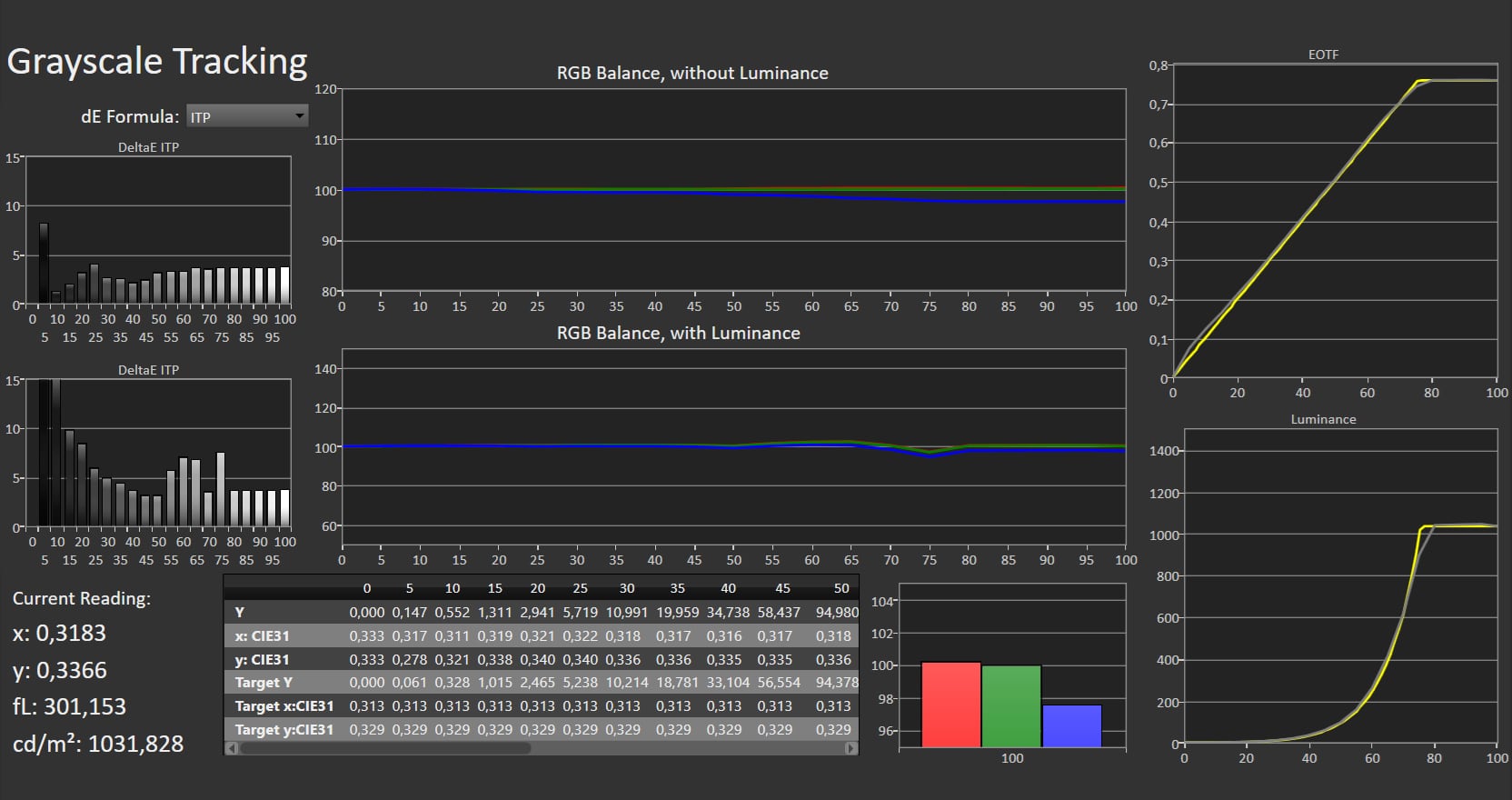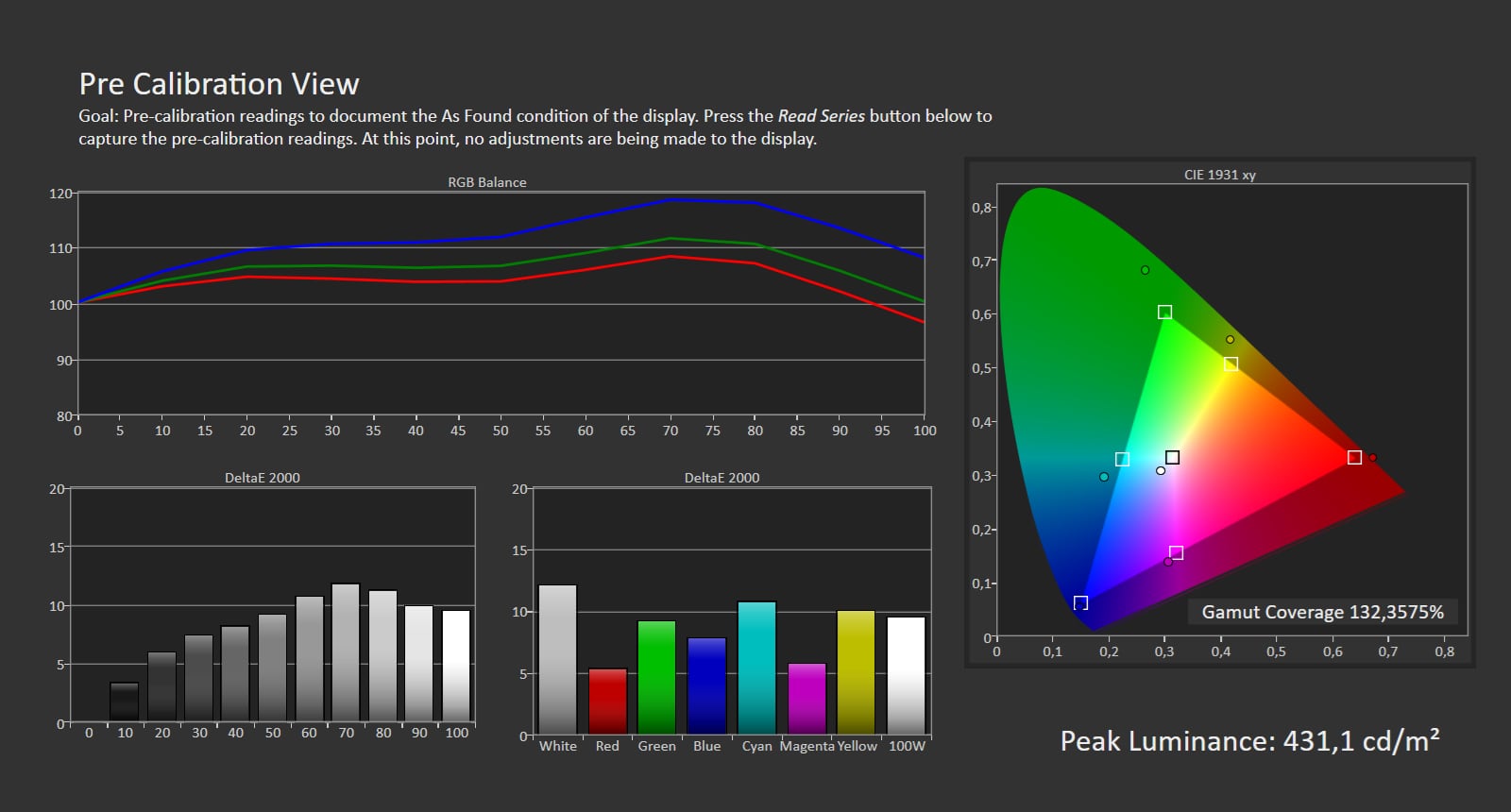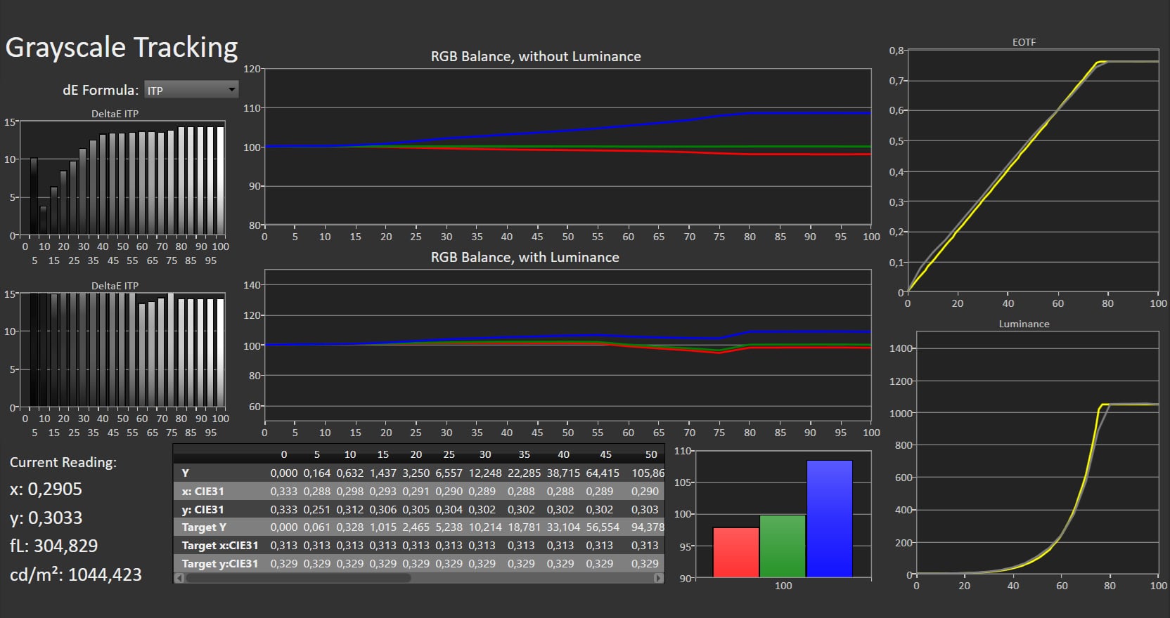 Som altid er der et utal af billedprofiler at vælge mellem. TV'et står som udgangspunkt i Eco-tilstand, for at kunne score højt på EU's energiskala, men denne leverer ikke så præcis billedkvalitet, mens Crystal Clear er den mest ekstreme. Den mest præcise er som sædvanlig Filmmaker Mode, selv hvis du ikke ser film/serier. Denne billedprofil giver mere eller mindre præcis de farver, som inputsignalet beder om, og er i øvrigt mere præcis i OLED810 end i sidste års OLED809. Game-profilen er derimod ikke så farvekorrekt, som man kunne ønske sig, men omvendt heller ikke så ekstrem som hos eksempelvis Samsung. Ved at slå 'Gamut Optimiser' fra i billedmenuen kommer man et par skridt tættere på i Game-profilen. Overordnet vil igen vi opfordre Philips til at reducere mængden af billedprofiler. Med udgangspunkt i Filmmaker Mode er det begrænset, hvor meget yderligere, der er at hente, men et par småjusteringer i vores kalibrering gav alligevel lidt. Se det kalibrerede resultat nedenfor. Der er imidlertid stadig en fejl, der gør, at man ikke kan justere den mørke end af RGB (rød, grøn, blå). Offset-indstillingen (mørke ende) reagerer nu slet ikke, hvilket er en ændring ift. sidste år, hvor den fejlagtigt styrede Gain (den lyse ende af RGB). Vi har observeret lignende fejl på Google TV fra andre mærker, så fejlen må ligge i Googles software. Hvad angår HDR, så er det igen Filmmaker Mode, du skal have fat i, hvis du vil have præcise farver. I Filmmaker Mode leverer OLED810 op til 1300 nits højlys, hvilket er mere en sidste års OLED809 på 1100 nits, om end forskellen er beskeden. I Game-profilen, der i HDR er fornuftig, leveres op til 1050 nits højlys. I Crystal Clear, der er noget mere blålig, leveres op til 1500 nits, hvilket er det tal, som Philips tidligere på året talte om som maks for 2025-udgaven af det "normale" OLED-panel, altså i modsætning til de nye, mere lysstærke 4-lags RGB Tandem OLED-panel i årets 9-serier. Det er fint at se, at det normale panel også taktvist bliver mere lysstærkt. Lysstyrken i fuld skærm er op til 215 nits, hvilket er uændret. Og igen anbefaler vi Filmmaker Mode til indhold i Dolby Vision. Husk at du skal skifte billedprofil for hhv. SDR, HDR og Dolby Vision, altså tre gange. Det kan gøres når indhold i det pågældende format afspilles. Dækning af farverummet er den samme som på andre TV med det regulære OLED-panel, altså omtrent 99% DCI-P3 og 72% Rec.2020.Målte billedprofiler