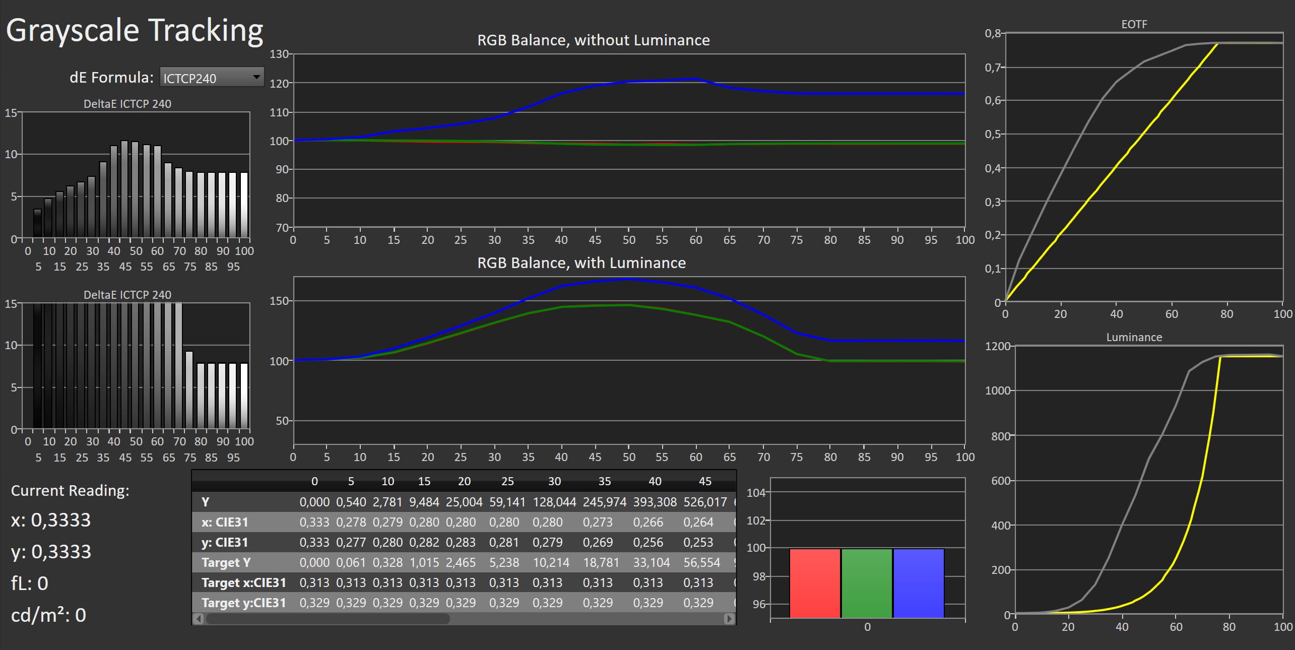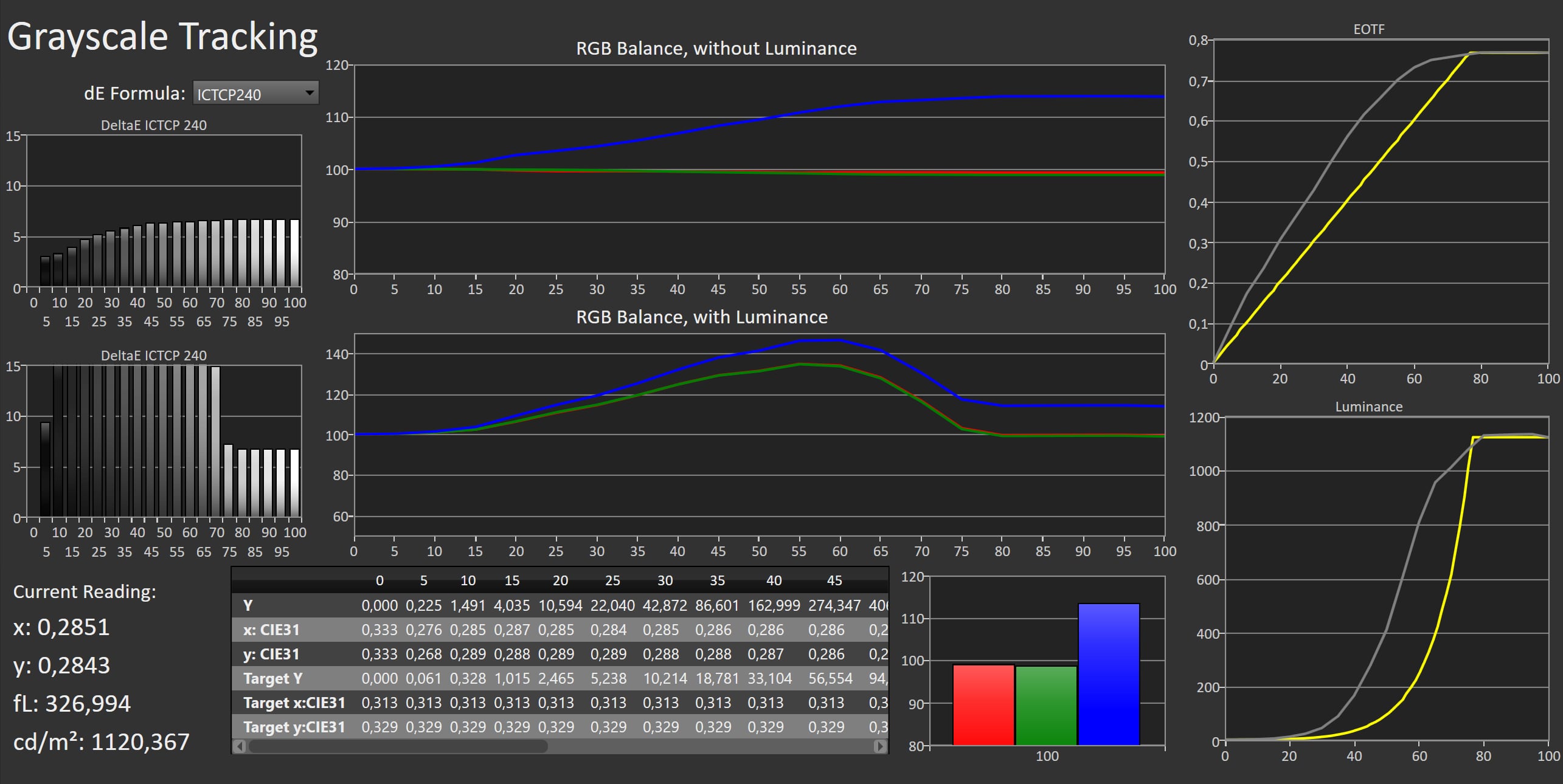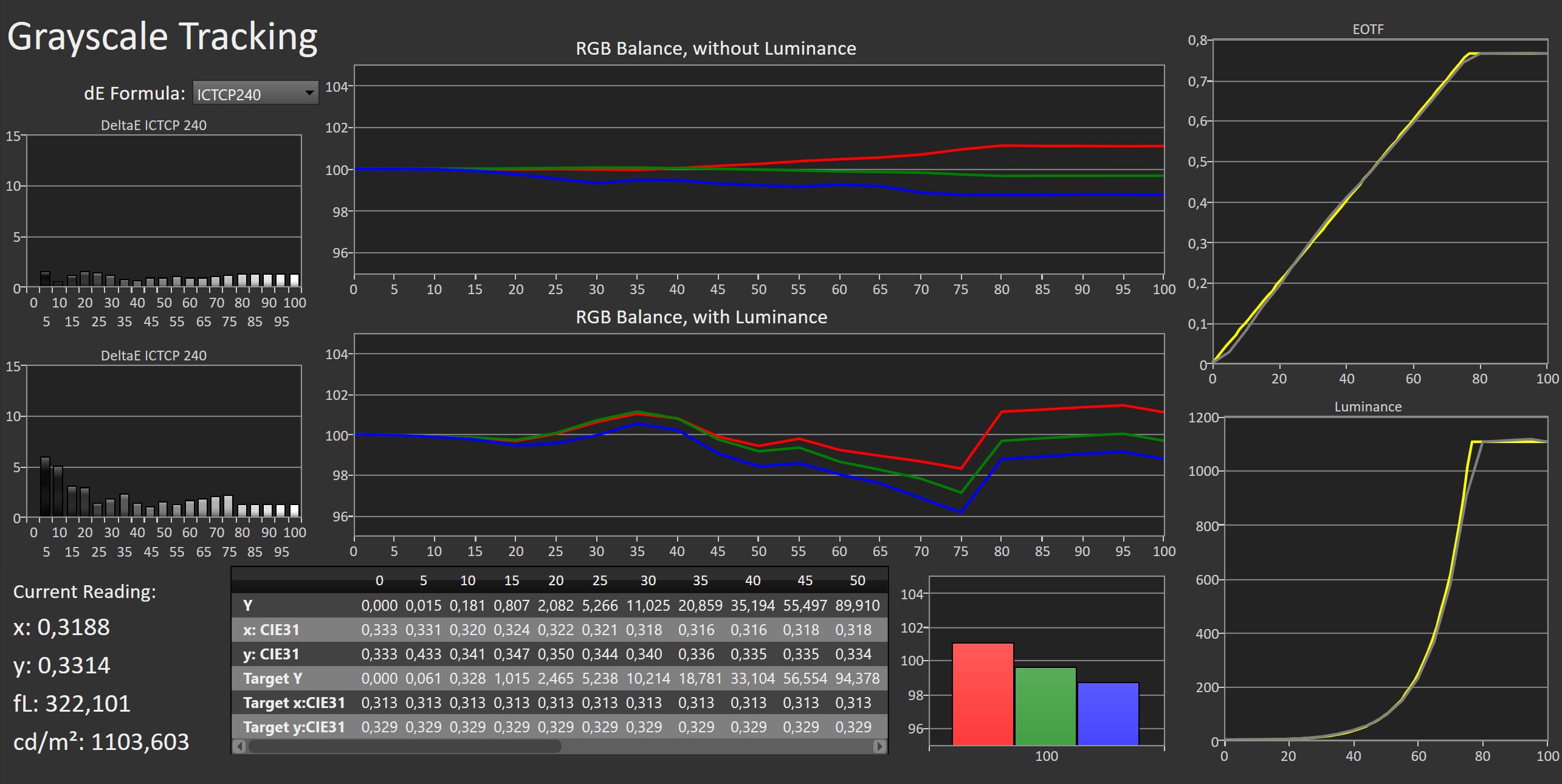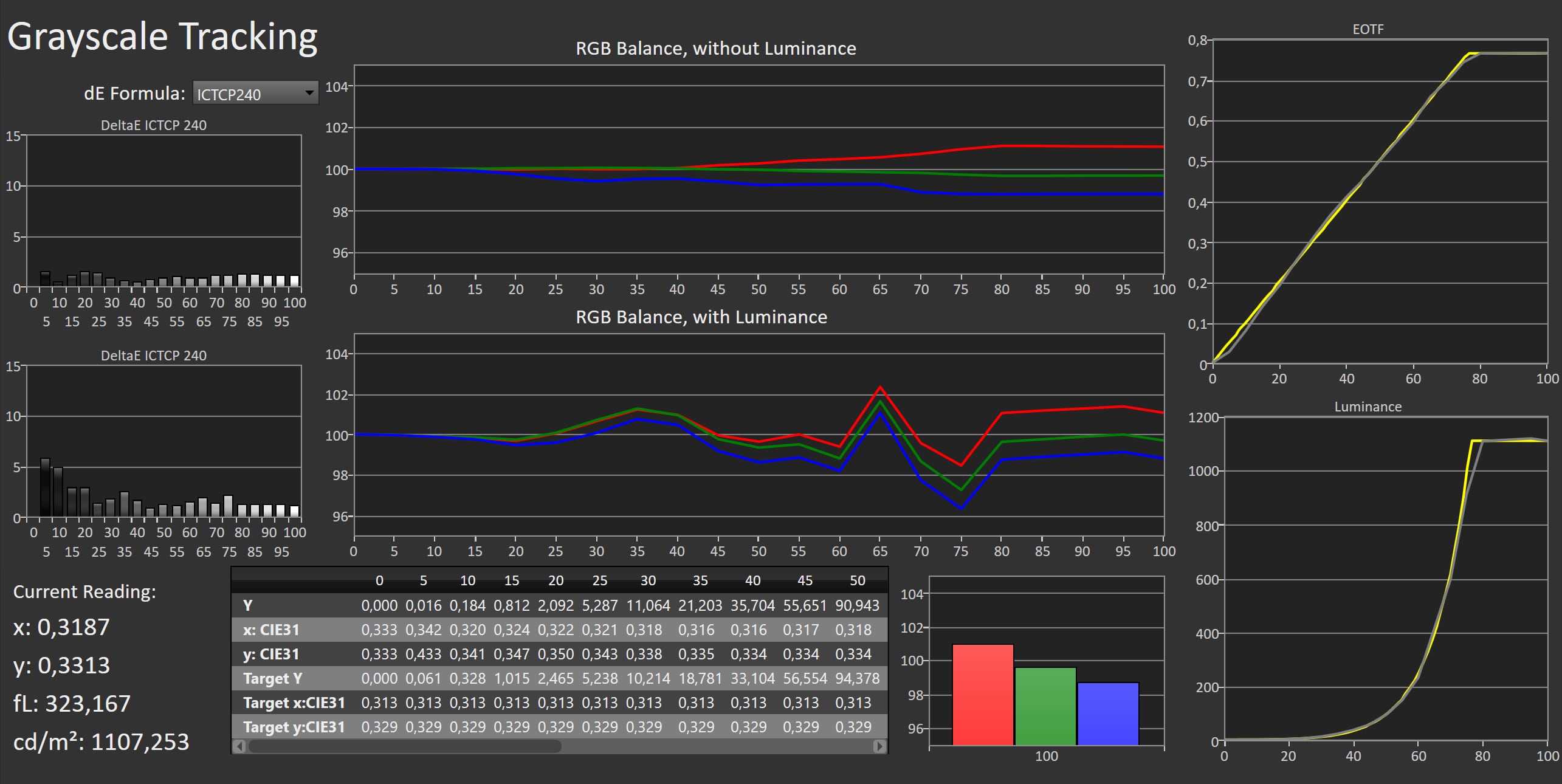 Vores "målinger"-afsnit omhandler alle de ting vi går og måler på TV'ene samlet ét sted frem for at ligge i de enkelte afsnit. Vi henviser til vores artikel omkring bl.a. målemetoder her for en gennemgang af hvordan vi måler under testen. Bemærk: I 2021 implementerede vi en ny metode for måling af gennemsnitligt strømforbrug i SDR og HDR, hvilket gør at tidligere års målinger ikke er 1:1 sammenlignelige. I SDR måles der i 'Kalibreret' strømforbrug ved en lysstyrke ca. 100-110 nits for at normalisere målingerne på tværs af skærme (vores anbefaling for kalibrerede billedindstillinger kan variere). Denne metode vil blive anvendt fremadrettet.Bemærk: Vi har under testen ikke benyttet os af lyssensoren, men ønsker du, at TV'et selv kompenserer for lyset i stuen, så kan dette aktiveres i menuen.Billedkvalitet